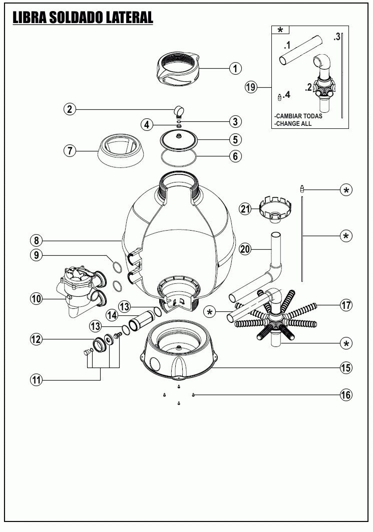 Filtro con válvula fabricado en polipropileno resistente a agentes químicos y climáticos. Moldeado por inyección con las dos mitades soldadas térmicamente. Con válvula de 6 vías montada lateralmente.